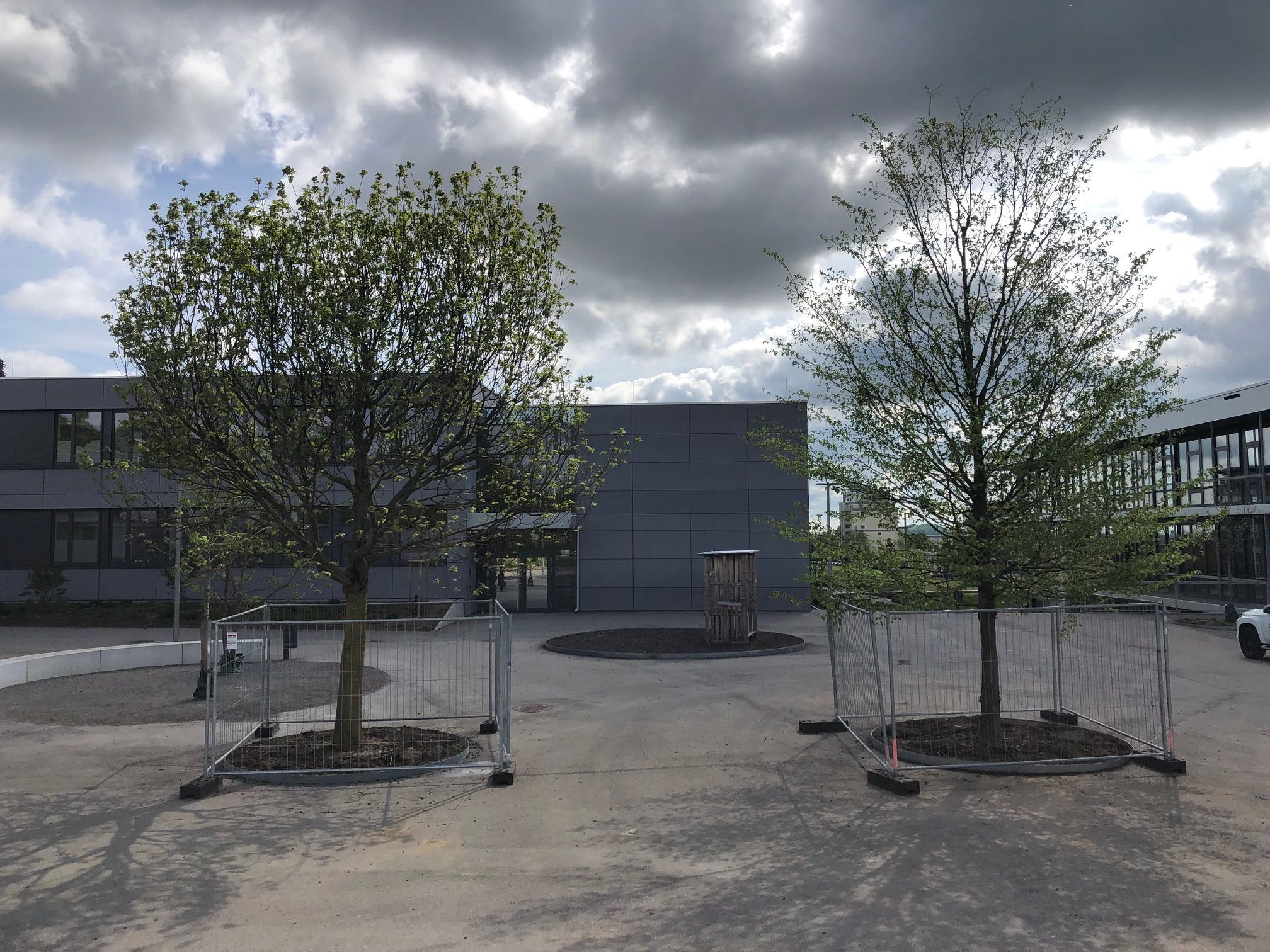 Mehr Schatten auf dem Campus sollen zwei Bäume spenden, die von der Stadtverwaltung nun eingepflanzt wurden. Mit großem Gerät kamen die beiden Bäume von der Baumschule in Möglingen. Dies war ein großes Ereignis für die Schülerinnen und Schüler, die mit großem Interesse die Aktion verfolgten. Weitere Maßnahmen mit dem Einbau von Beschattungselementen am Eingang des Primarstufengebäudes sollen folgen. Auch der „Steineplage“ auf dem Schulgelände will man laut Stadtverwaltung in nächster Zeit Herr werden.