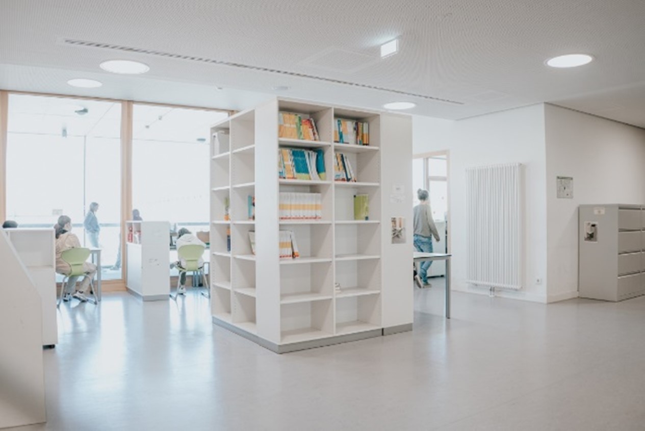 Alle Cluster sehen gleich aus. In der Mitte befindet sich der Kubus, der mit den Lehrwerken der jeweiligen Stufen befüllt ist. Ringsherum befinden sich Einzel- und Gruppenarbeitsplätze.
